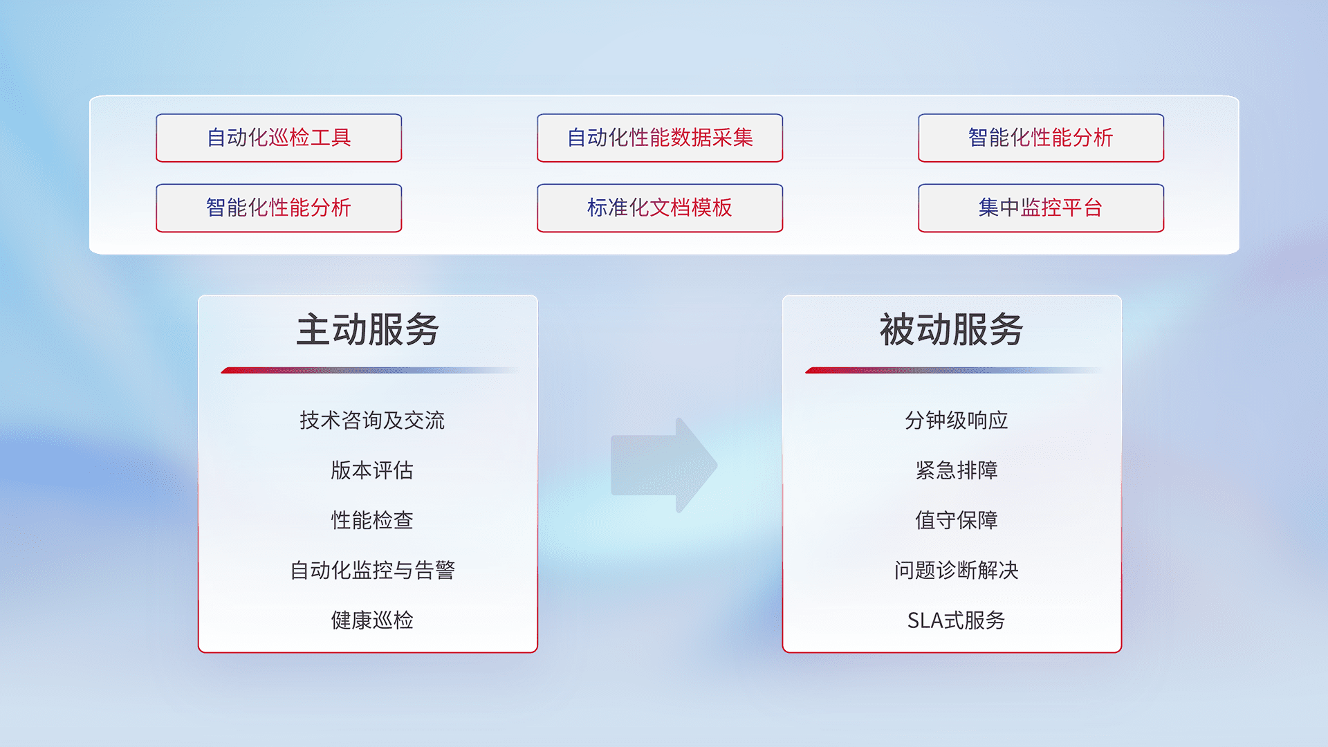 智能化工具和标准化文档,,保障服务质量,,提供主动服务(包含技术咨询、、、、版本评估、、、性能检查、、、、自动化监控与告警、、、健康巡检)和被动服务包含(分钟级响应、、、紧急排障、、、、值守保障、、、问题诊断解决、、、、SLA服务)。。
