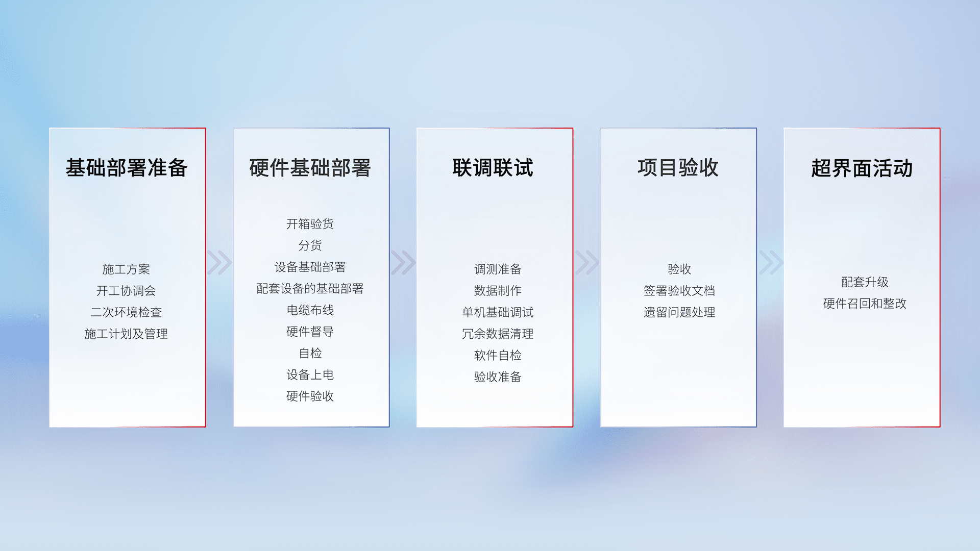 从基础部署准备、、硬件基础部署、、、、联调联试、、项目验收、、、越界面活动的全过程可追溯,,,保证施工质量和进度。。。。
